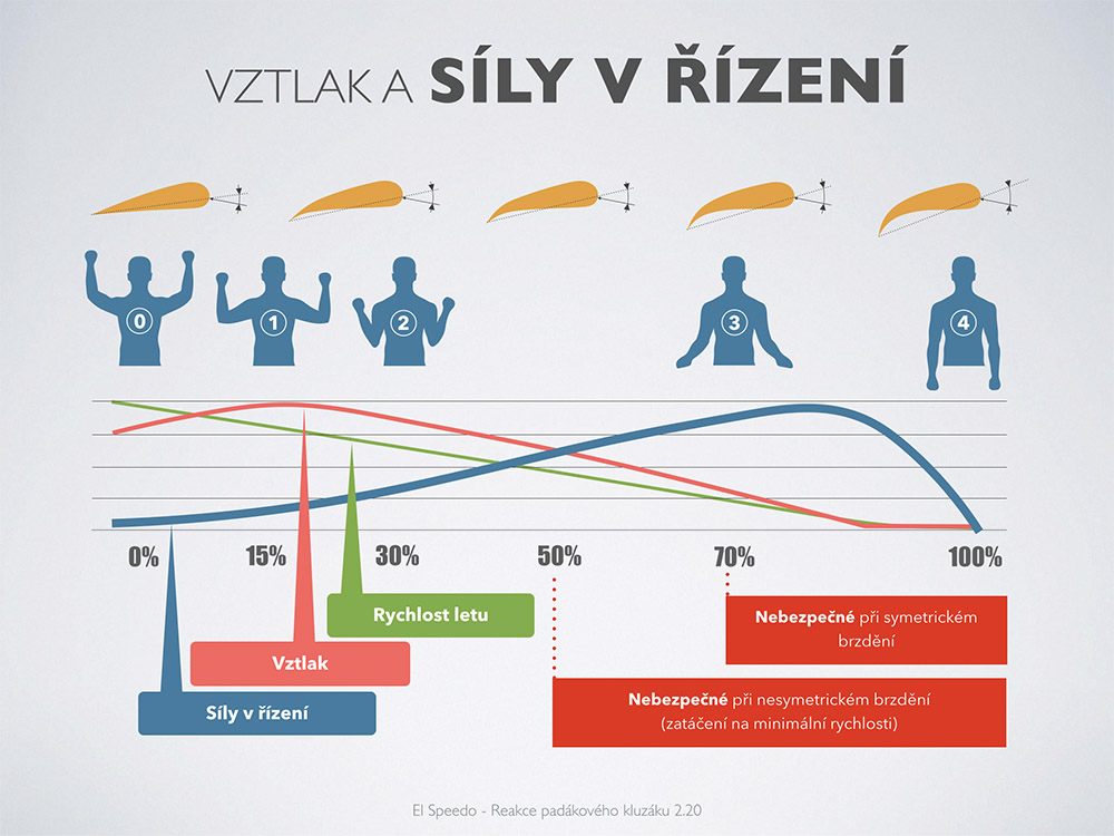 Dovolil bych si ještě pár vět o padákových kluzácích a pilotech. Velmi dobře si pamatuji své první padáky, a pokud se zaměřím na kategorii pro začínající piloty, byly to konstrukce velmi stabilní, ale s výkony podstatně nižšími, než ty dnešní. Zranění pilotů na těchto padákových kluzácích se děly, ale myslím, že převážně z neznalostí a z obrovského podcenění meteorologické situace. Dnešní padáky jsou lehčí, daleko lépe startují, díky slušnému rozsahu rychlostí dokážou točit na malých poloměrech, a výkony při přímém letu už jsou taky někde úplně jinde. Piloti létající na kategoriích EN A a EN B jsou často v termickém stoupání zvýhodněni před stejně zkušenými piloty létajícími na vyšších kategoriích. Na těch se totiž všechno odehrává rychleji, padáky přesněji reagují na každé i menší nechtěné přibrzění a součet drobných pilotních chyb při točení se nekompromisně projeví. Ale i padákové kluzáky kategorie EN A a EN B jsou úplně jinde než stará “Áčka”. A tak také přístup pilotů k tréninku se musí měnit. Aktivní pilotáž už není téma jen pro pokročilé piloty, ale pro všechny, kdo chcete na současných padácích bezpečně létat. Je to téma, které má několik úrovní. Aktivní pilotáž je potřeba postupně zdokonalovat, přizpůsobovat ji tomu, na čem právě létáte. Udělat si licenci Sportovní pilot, aniž byste aktivně začali létat na kategoriích EN C nebo EN D je sice pěkné, ale trochu předčasné. Za dva roky se zase konstrukce posunou a bude třeba znova trénovat na to, abyste z těchto padáků vymačkali maximum.
