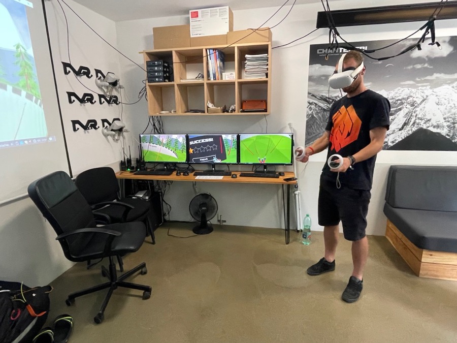 To vše můžeme trénovat ve čtyřech úrovních náročnosti, které nastavují potřebnou citlivost ovládání a rychlost odezvy vrchlíku. V aktuální používané verzi VR aplikace jsme vypnuli možnost pomáhat stabilizaci vrchlíku souběžnými úkroky do stran. Tato funkcionalita je vzhledem k omezenému vnitřnímu prostoru potencionálně nebezpečná a proto se jí věnujeme až v druhé části ve volné přírodě.