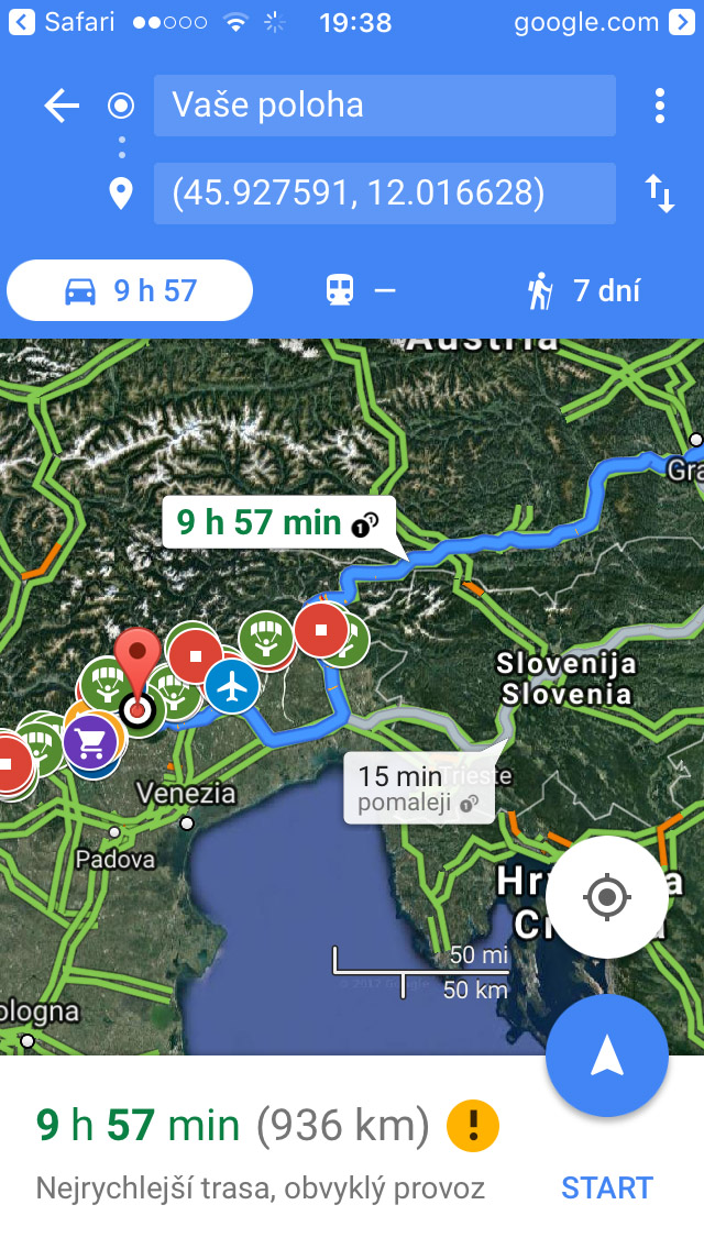 Klikněte na šipku navigace a nechte se prostřednictvím Google map navigovat na vámi vybrané místo.