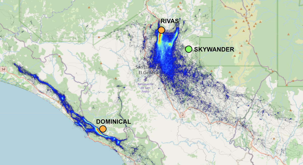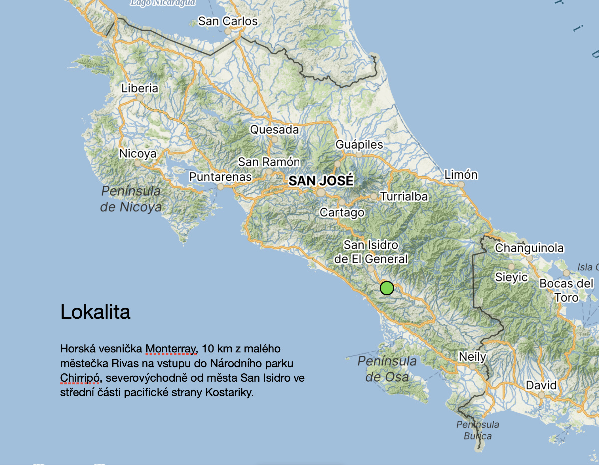 Kostarika, 15 kilometrů východně od města San Issidro, na konci cesty horské vesničky Monterrey sousedící s Národním parkem Chirripó, ve výšce 1400 metrů.