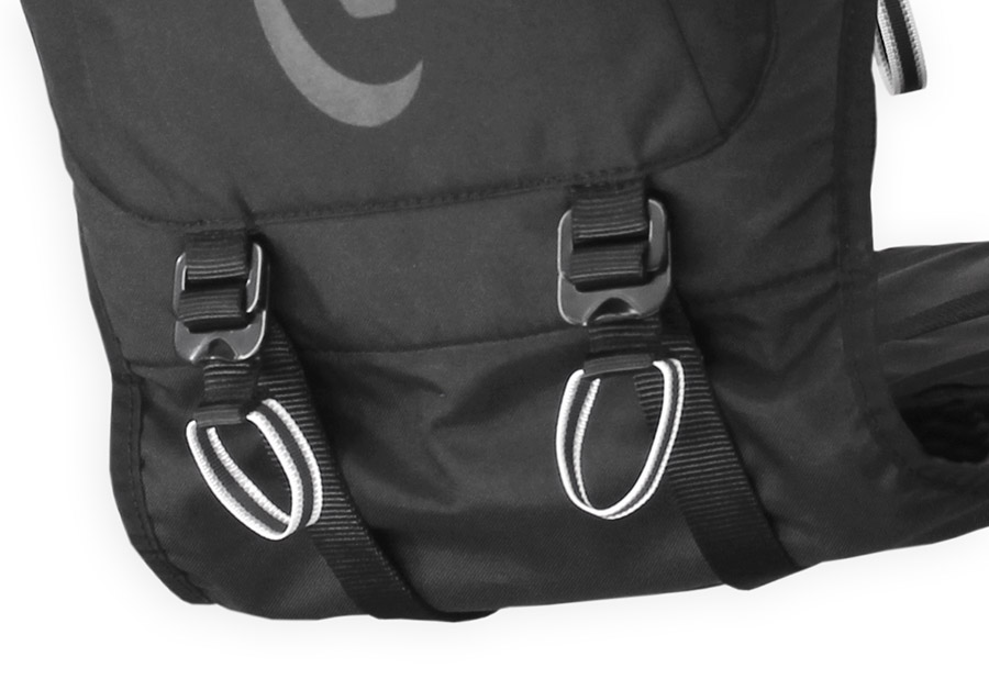 Rádiové spojení s instruktorem je důležitým pojítkem při nácviku křížových startů a proto sedačka GMT má kapsičku na vysílačku už standardně všitou do levé strany ramenních popruhů. Pro zajištění vysílačky je použita gumová lemovka a suchý zip.