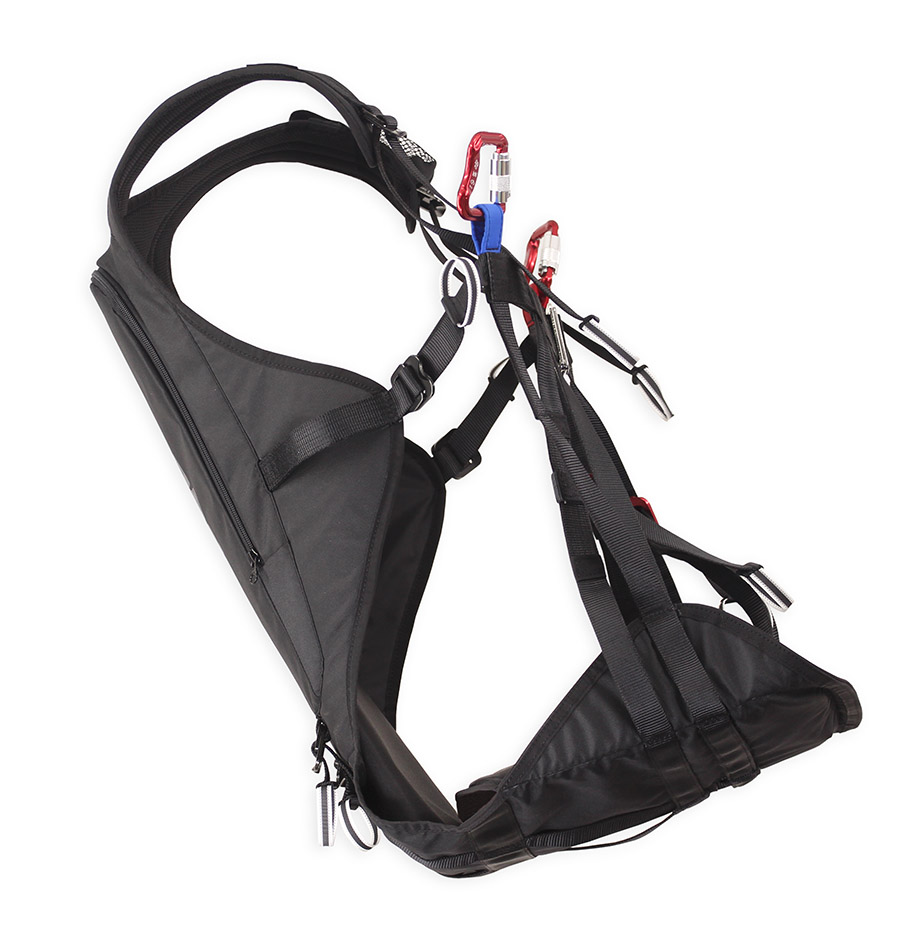 Ve stoje je posedová deska tažená popruhem bližším k zádové části do vertikální polohy, takže pilotovi netlačí do stehen. Při zavěšení do karabin je pak posedová deska tažena popruhem v přední části a umožňuje tak lepší dosednutí.